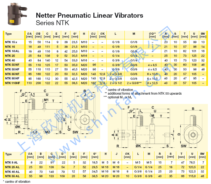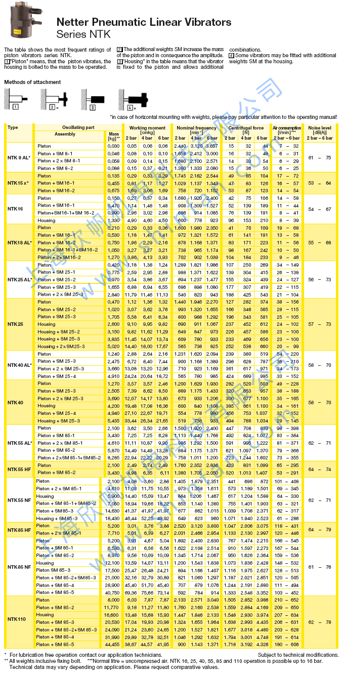 NTK型氣壓振動器可分為硬化樹脂外殼,及鋁合金硬化染黑外殼。本體的中心有一活塞往復式振動,活塞軸心可加重錘以改變,出力及轉速、振輻。氣壓式運轉,可以增加不同重錘,活塞非常輕巧。本體的運作并不會產生撞擊。非常嚴謹的生產制造。 硬化樹脂本體NTK8AL,NTK15X,NTK18AL,NTK25AL 可在免潤滑劑下運轉。使用溫度5°C ~ 60°C 使用型號可由非常輕巧的NTK8AL型,一直到NTK110型。